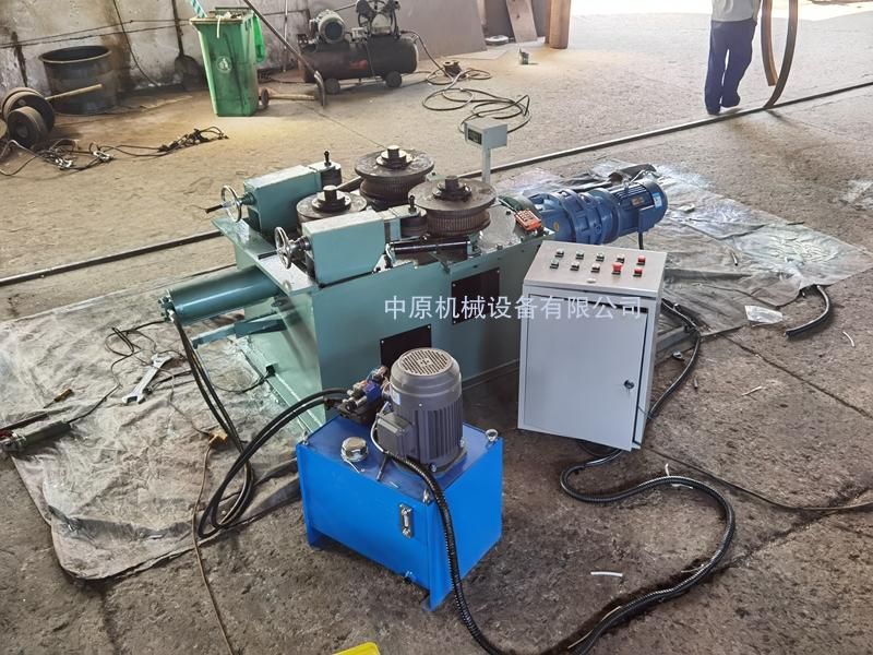該機(jī)為叁輥型材卷圓機(jī),集機(jī)電一體。電機(jī)輸出的較高轉(zhuǎn)速通過傳動(dòng)裝置(聯(lián)軸器,減速機(jī),齒輪等)轉(zhuǎn)換成所需的大扭矩低轉(zhuǎn)速,帶動(dòng)固定位置的兩主動(dòng)輥實(shí)現(xiàn)旋轉(zhuǎn)運(yùn)動(dòng),為型材行走提供扭矩。被動(dòng)輥通過油缸前進(jìn)、后退實(shí)現(xiàn)位移,來控制直徑大小。三個(gè)工作輥成等腰三角形分布,通過調(diào)整移動(dòng)輥實(shí)現(xiàn)這三個(gè)點(diǎn)形成的弧線達(dá)到所需彎曲半徑,借助被動(dòng)輥的壓緊及兩主動(dòng)輥的旋轉(zhuǎn)運(yùn)動(dòng),使型材經(jīng)過多次連續(xù)彎曲,產(chǎn)生永久性塑性變形,用于常溫狀態(tài)下將型材卷制成圓形,弧形等工件。